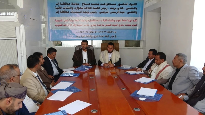 نظمّت الهيئة العامة للموارد والمنشآت المائية بمحافظة إب، بالتنسيق مع النيابة العامة، اليوم ورشة عمل تدريبية لتعزيز كفاءة مأموري الضبط القضائي في إعداد وتحرير محاضر الضبط وجمع الاستدلالات وفق الإجراءات القانونية المعتمدة لحماية الموارد المائية.