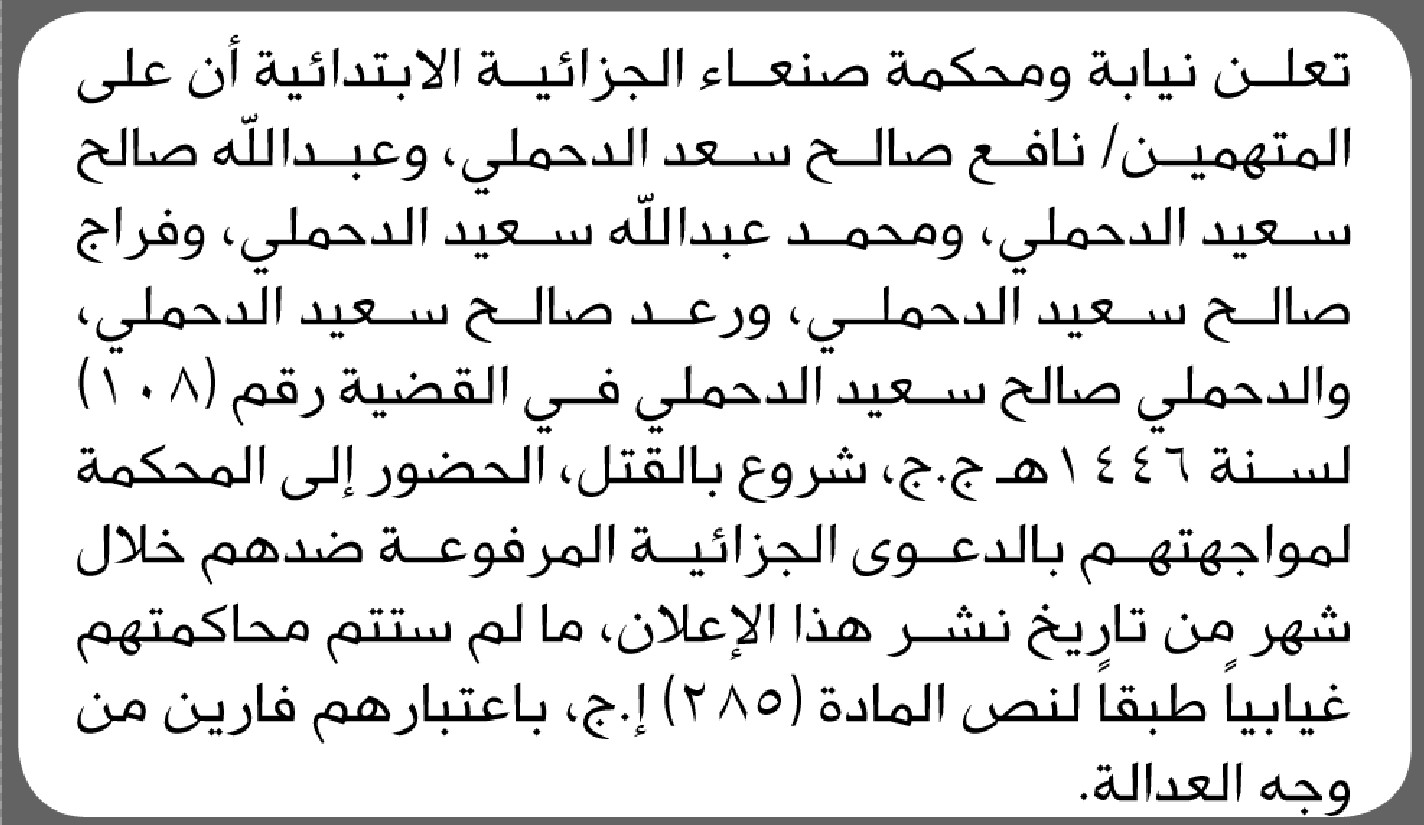تعلن نيابة ومحكمة صنعاء الجزائية بأن على/ نافع الدحملي وآخرين الحضور إلى المحكمة إعلاناتمحاكم On أكتوبر 16, 2025 Share Share FacebookTwitterWhatsAppTelegramGoogle+البريد الإلكترونيPrint