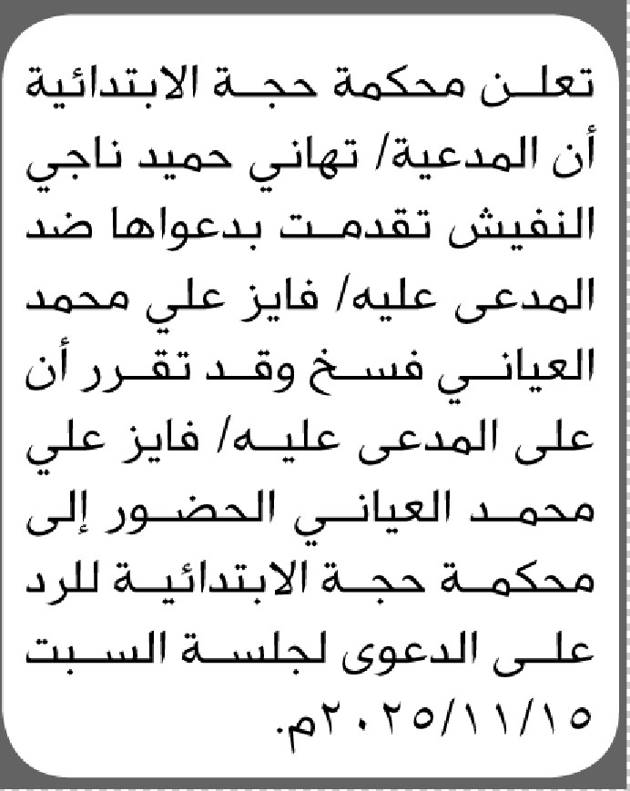 تعلن محكمة حجة أن على المدعى عليه فايز علي العياني الحضور إلى المحكمة إعلاناتمحاكم On أكتوبر 16, 2025 Share Share FacebookTwitterWhatsAppTelegramGoogle+البريد الإلكترونيPrint