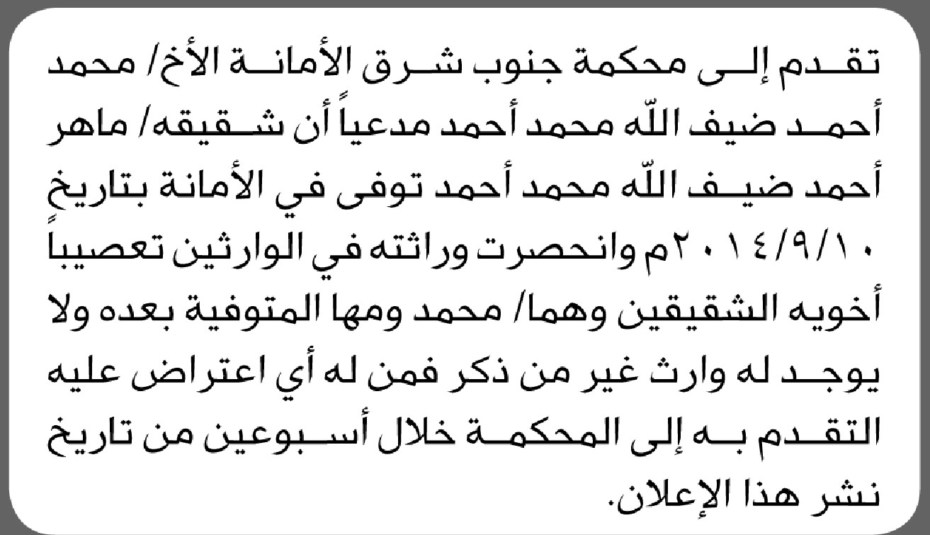 تقدم الى محكمة جنوب شرق الأمانة الأخ/ محمد أحمد بطلب انحصار وراثة إعلاناتمحاكم On أكتوبر 17, 2025 Share Share FacebookTwitterWhatsAppTelegramGoogle+البريد الإلكترونيPrint