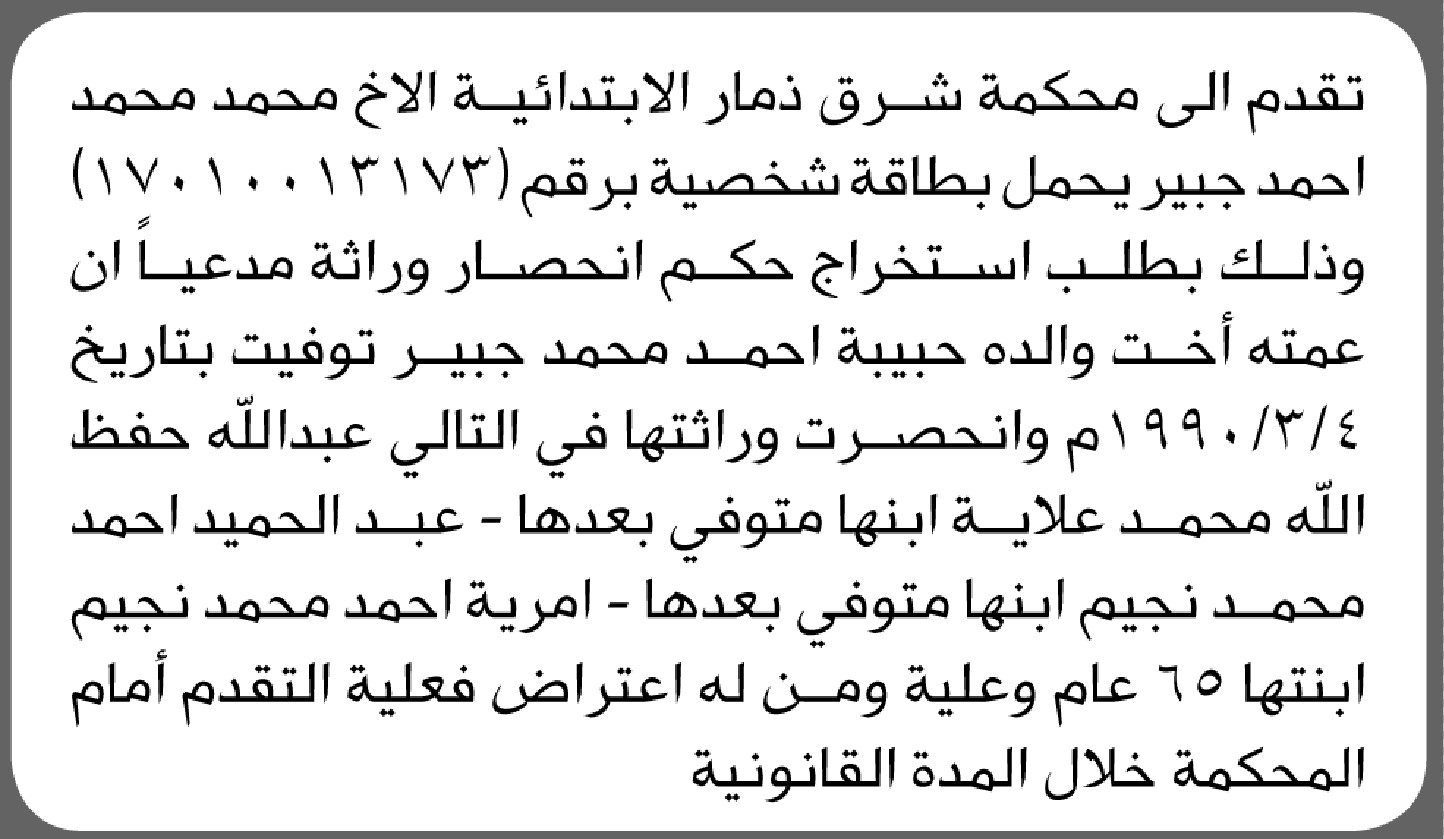 تقدم الى محكمة شرق ذمار الأخ محمد جبير بطلب حكم انحصار وراثة إعلاناتمحاكم On أكتوبر 17, 2025 Share Share FacebookTwitterWhatsAppTelegramGoogle+البريد الإلكترونيPrint