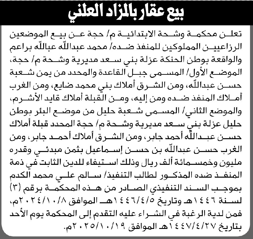 تعلن محكمة وشحة الابتدائية م/ حجة عن بيع عقار المنفذ ضده/ محمد براعم إعلاناتمحاكم On أكتوبر 17, 2025 Share Share FacebookTwitterWhatsAppTelegramGoogle+البريد الإلكترونيPrint