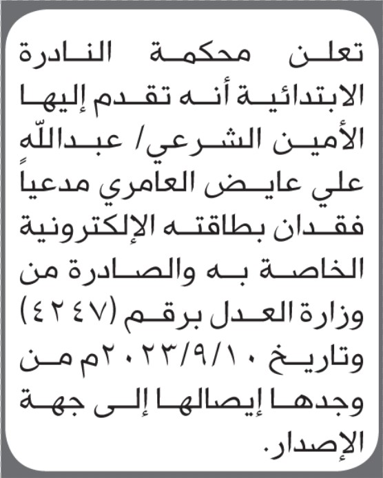 تعلن محكمة النادرة أن الأمين الشرعي عبدالله علي العامري تقدم بدعوى فقدان بطاقته الإلكترونية إعلاناتمحاكم On أكتوبر 18, 2025 Share Share FacebookTwitterWhatsAppTelegramGoogle+البريد الإلكترونيPrint