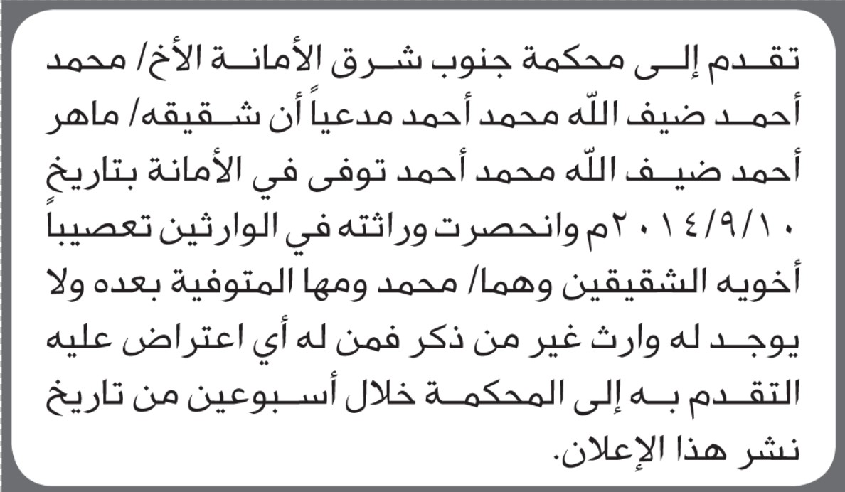 تعلن محكمة جنوب شرق الأمانة أن الأخ محمد أحمد ضيف الله تقدم بدعوى انحصار وراثة إعلاناتمحاكم On أكتوبر 18, 2025 Share Share FacebookTwitterWhatsAppTelegramGoogle+البريد الإلكترونيPrint