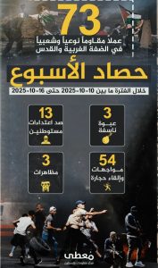 أفاد مركز معلومات فلسطين (مُعطى) ، اليوم الجمعة ، بتنفيذ 73 عملاً مقاوماً نوعياً وشعبياً في الضفة والقدس المحتلة خلال الفترة من 10 وحتى 16 أكتوبر 2025.