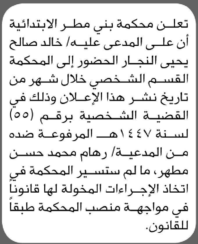 تعلن محكمة بني مطر بأن على/ خالد النجار الحضور إلى المحكمة إعلاناتمحاكم On أكتوبر 19, 2025 Share Share FacebookTwitterWhatsAppTelegramGoogle+البريد الإلكترونيPrint