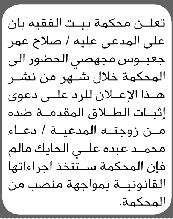 تعلن محكمة بيت الفقية ان على المدعى عليه صلاح مجهصي الحضور إلى المحكمة إعلاناتمحاكم On أكتوبر 19, 2025 Share Share FacebookTwitterWhatsAppTelegramGoogle+البريد الإلكترونيPrint