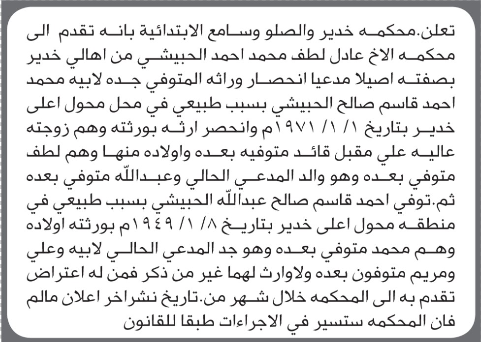 تعلن محكمة خدير والصلو وسامع الابتدائية بأن الأخ/ عادل الحبيشي تقدم إليها بطلب انحصار وراثة إعلاناتمحاكم On أكتوبر 20, 2025 Share Share FacebookTwitterWhatsAppTelegramGoogle+البريد الإلكترونيPrint