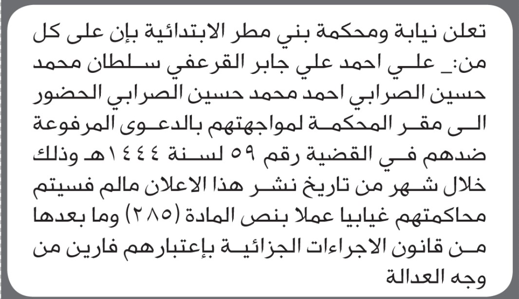 تعلن نيابة ومحكمة بني مطر بإن على المذكورة اسماؤهم الحضور الى المحكمة إعلاناتمحاكم On أكتوبر 20, 2025 Share Share FacebookTwitterWhatsAppTelegramGoogle+البريد الإلكترونيPrint