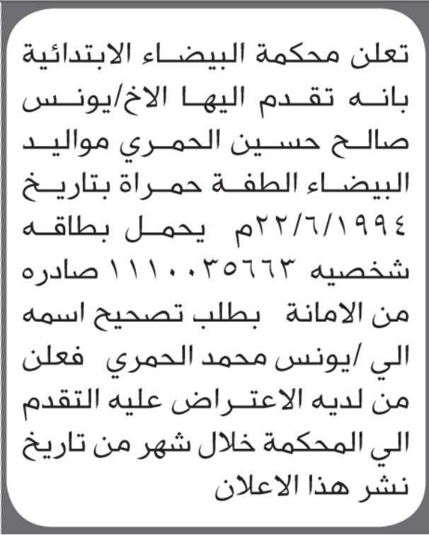 تعلن محكمة البيضاء أن الأخ يونس صالح الحمري تقدم بطلب تصحيح اسمه إعلاناتمحاكم On أكتوبر 20, 2025 Share Share FacebookTwitterWhatsAppTelegramGoogle+البريد الإلكترونيPrint