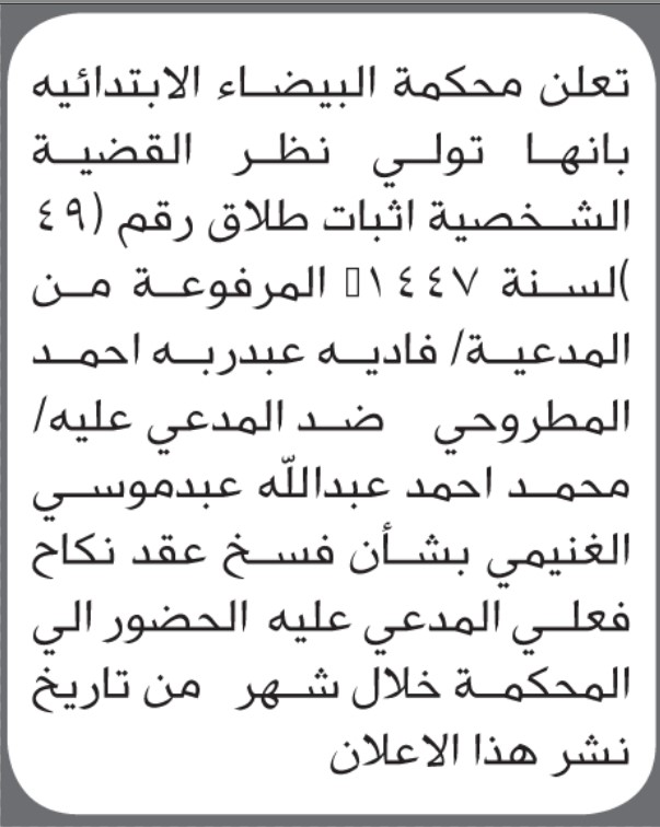 تعلن محكمة البيضاء أن على المدعى عليه محمد أحمد الغنيمي الحضور إلى المحكمة إعلاناتمحاكم On أكتوبر 20, 2025 Share Share FacebookTwitterWhatsAppTelegramGoogle+البريد الإلكترونيPrint