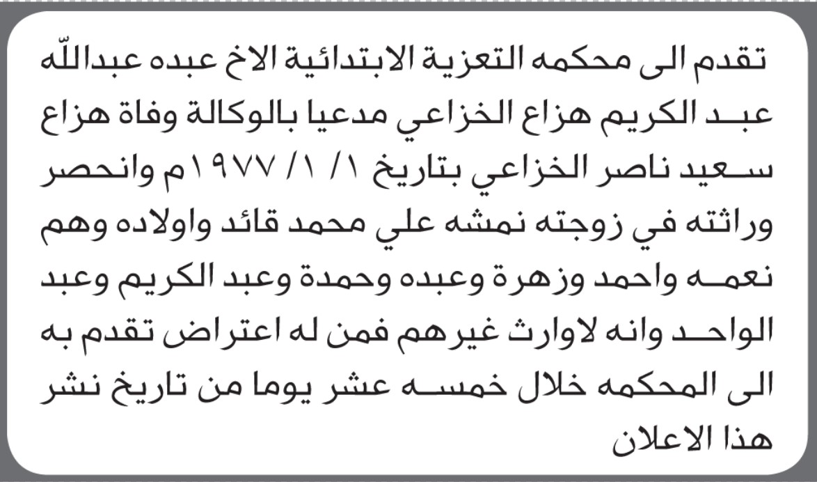 تعلن محكمة التعزية أن الأخ عبده عبدالله الخزاعي تقدم بدعوى انحصار وراثة إعلاناتمحاكم On أكتوبر 20, 2025 Share Share FacebookTwitterWhatsAppTelegramGoogle+البريد الإلكترونيPrint