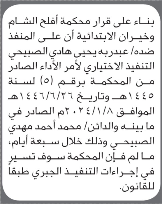 تعلن محكمة أفلح الشام وخيران أن على المنفذ ضده عبدربه يحيى الصبيحي التنفيذ الاختياري لأمر الأداء إعلاناتمحاكم On أكتوبر 21, 2025 Share Share FacebookTwitterWhatsAppTelegramGoogle+البريد الإلكترونيPrint