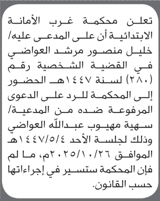 تعلن محكمة غرب الأمانة أن على المدعى عليه خليل منصور العواضي الحضور إلى المحكمة إعلاناتمحاكم On أكتوبر 21, 2025 Share Share FacebookTwitterWhatsAppTelegramGoogle+البريد الإلكترونيPrint