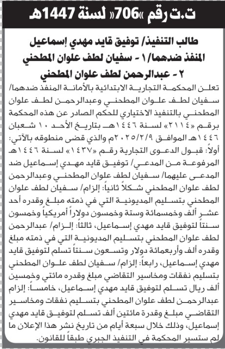 تعلن المحكمة التجارية الابتدائية بأن على المنفذ ضدهم/ سفيان وعبدالرحمن المطحني التنفيذ الاختياري إعلاناتمحاكم On أكتوبر 21, 2025 Share Share FacebookTwitterWhatsAppTelegramGoogle+البريد الإلكترونيPrint