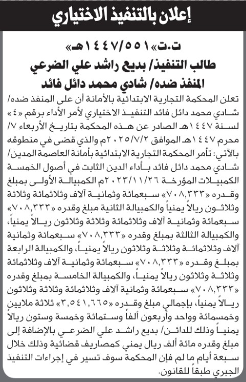 تعلن المحكمة التجارية بالأمانة أن على شادي قائد التنفيذ الاختياري للحكم إعلاناتمحاكم On أكتوبر 21, 2025 Share Share FacebookTwitterWhatsAppTelegramGoogle+البريد الإلكترونيPrint