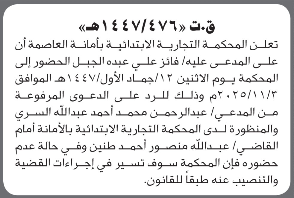 تعلن المحكمة التجارية بأمانة العاصمة أن على المدعى عليه فائز الجبل الحضور الى المحكمة إعلاناتمحاكم On أكتوبر 22, 2025 Share Share FacebookTwitterWhatsAppTelegramGoogle+البريد الإلكترونيPrint