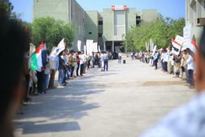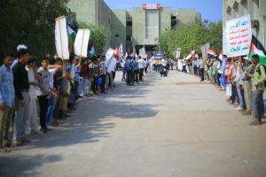 نظمت جامعة الحديدة وملتقى الطالب الجامعي صباح اليوم الاربعاء، وقفة تضامنية مع الشعب الفلسطيني واحتفاء بالإنتصارات التي حققتها المقاومة في قطاع غزة، تحت شعار” عامان من العطاء… ووفاء لدماء الشهداء” وتزامنا مع الذكرى الثانية لمعركة “الفتح الموعود والجهاد المقدس”.