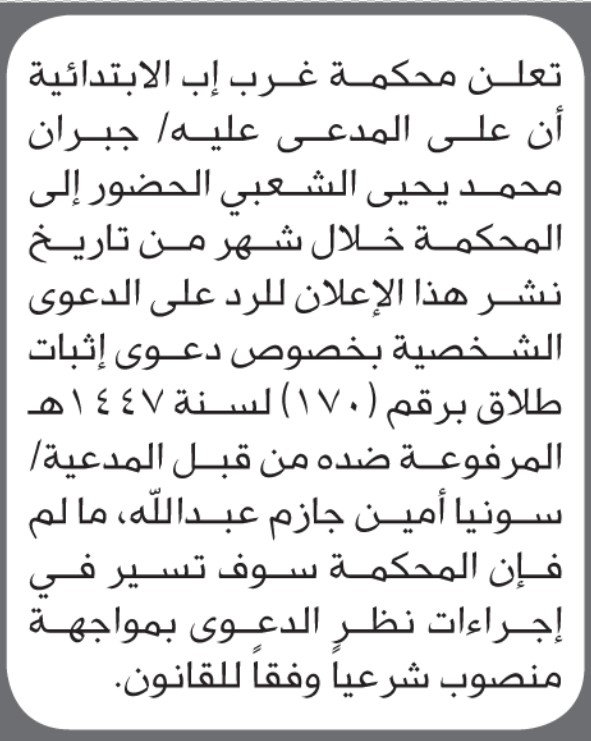 تعلن محكمة غرب إب بأن على/ جبران الشعبي الحضور إلى المحكمة إعلاناتمحاكم On أكتوبر 23, 2025 Share Share FacebookTwitterWhatsAppTelegramGoogle+البريد الإلكترونيPrint