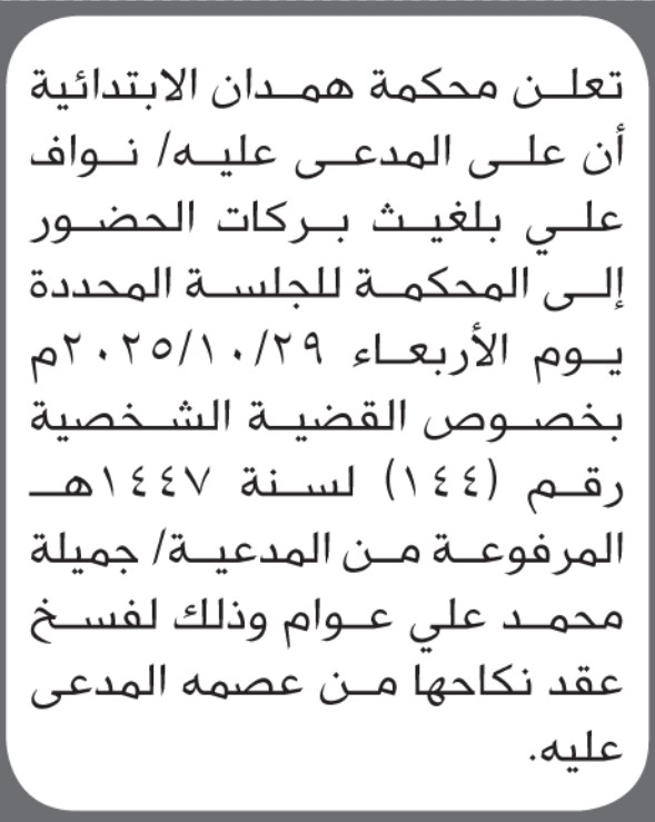 تعلن محكمة همدان الابتدائية بأن على/ نواف بركات الحضور إلى المحكمة إعلاناتمحاكم On أكتوبر 23, 2025 Share Share FacebookTwitterWhatsAppTelegramGoogle+البريد الإلكترونيPrint