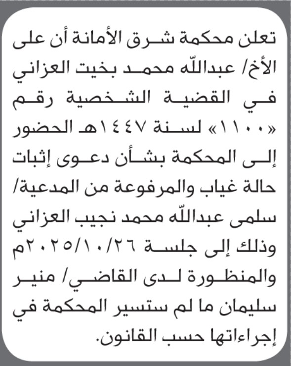 تعلن محكمة شرق الأمانة أن على الأخ عبدالله محمد العزاني الحضور إلى المحكمة إعلاناتمحاكم On أكتوبر 23, 2025 Share Share FacebookTwitterWhatsAppTelegramGoogle+البريد الإلكترونيPrint