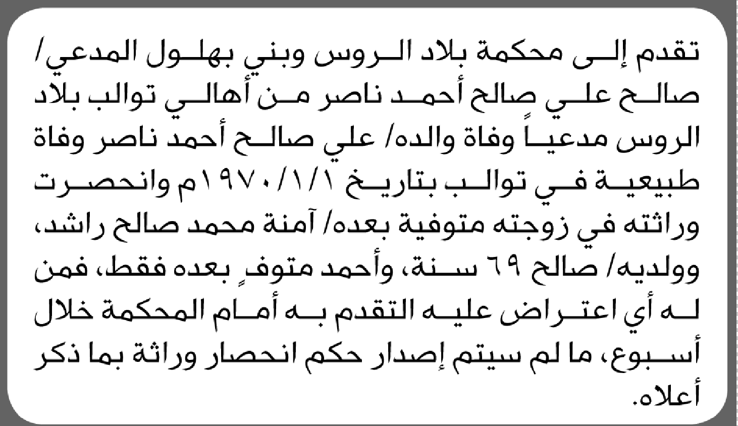 تعلن محكمة بلاد الروس وبني بهلول أن الأخ صالح علي صالح تقدم بدعوى انحصار وراثة إعلاناتمحاكم On أكتوبر 24, 2025 Share Share FacebookTwitterWhatsAppTelegramGoogle+البريد الإلكترونيPrint
