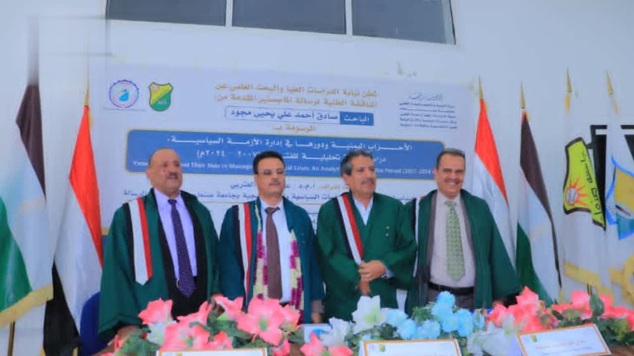 حصل الباحث صادق أحمد مجود، على درجة الماجستير بامتياز من مركز الدراسات السياسية والاستراتيجية بجامعة صنعاء عن رسالته الموسومة بـ” الأحزاب اليمنية ودورها في إدارة الأزمة السياسية- دراسة تحليلية للفترة من (2007- 2024م).