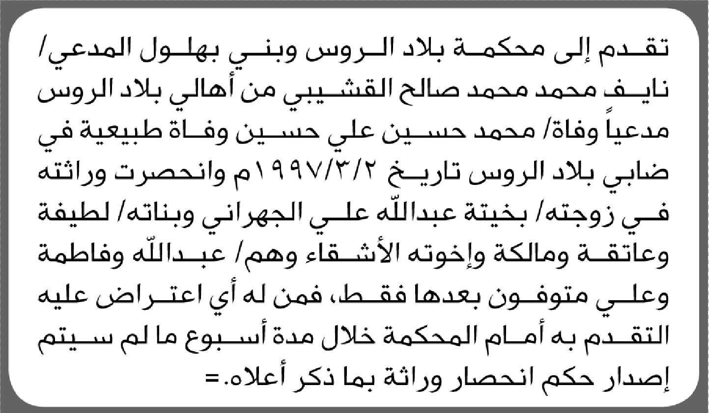 تعلن محكمة بلاد الروس وبني بهلول بأن الأخ/ نايف القشيبي تقدم إليها بطلب انحصار وراثة إعلاناتمحاكم On أكتوبر 24, 2025 Share Share FacebookTwitterWhatsAppTelegramGoogle+البريد الإلكترونيPrint