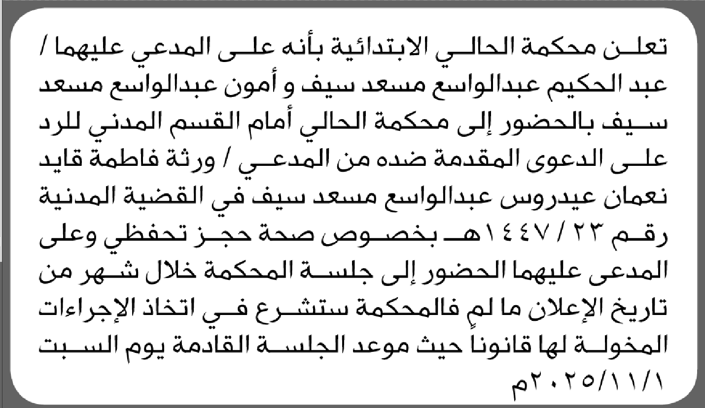 تعلن محكمة الحالي ان على المدعى عليهما عبدالحكيم وامون سيف الحضور إلى المحكمة إعلاناتمحاكم On أكتوبر 24, 2025 Share Share FacebookTwitterWhatsAppTelegramGoogle+البريد الإلكترونيPrint