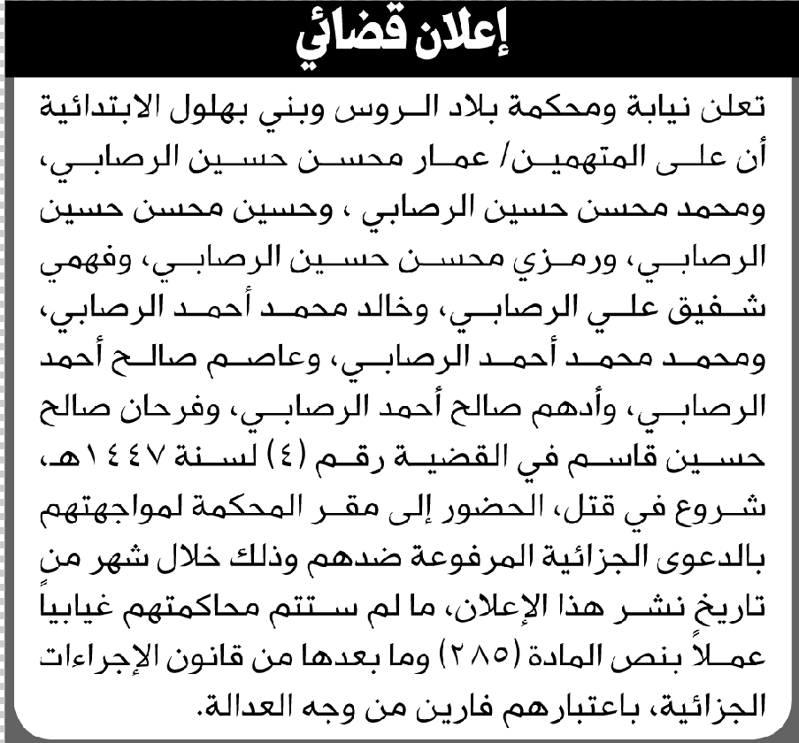 تعلن محكمة بلاد الروس وبني بهلول أن على المتهمين الحضور الى المحكمة إعلاناتمحاكم On أكتوبر 24, 2025 Share Share FacebookTwitterWhatsAppTelegramGoogle+البريد الإلكترونيPrint