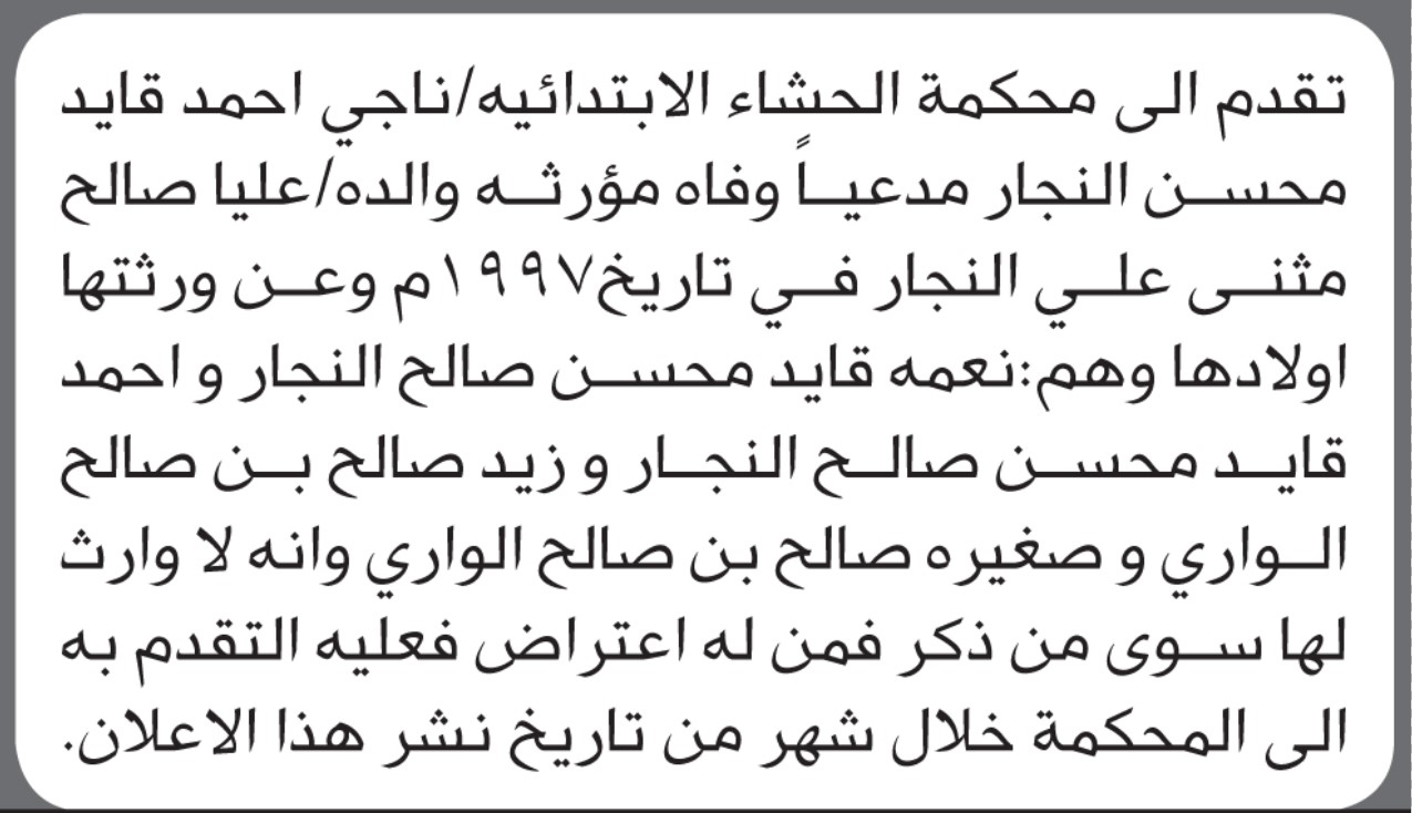 تعلن محكمة الحشاء أن الأخ ناجي أحمد النجار تقدم بدعوى انحصار وراثة إعلاناتمحاكم On أكتوبر 25, 2025 Share Share FacebookTwitterWhatsAppTelegramGoogle+البريد الإلكترونيPrint
