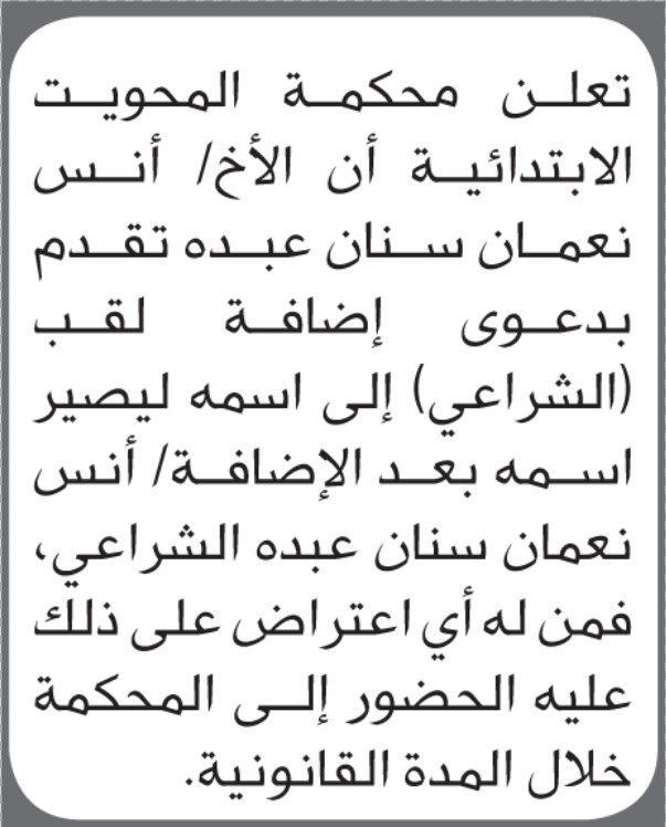 تعلن محكمة المحويت أن الأخ أنس نعمان سنان تقدم بطلب إضافة لقب إلى اسمه إعلاناتمحاكم On أكتوبر 25, 2025 Share Share FacebookTwitterWhatsAppTelegramGoogle+البريد الإلكترونيPrint