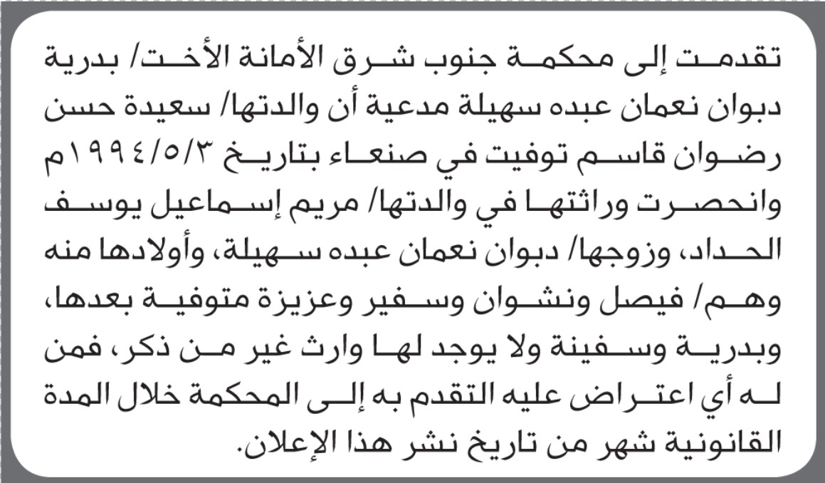 تعلن محكمة جنوب شرق الأمانة أن الأخت بدرية دبوان نعمان تقدمت بدعوى انحصار وراثة إعلاناتمحاكم On أكتوبر 25, 2025 Share Share FacebookTwitterWhatsAppTelegramGoogle+البريد الإلكترونيPrint