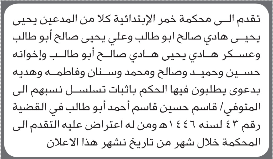 تعلن محكمة خمر أن الأخوة يحيى أبو طالب وآخرين تقدموا بدعوى إثبات تسلسل نسب إعلاناتمحاكم On أكتوبر 25, 2025 Share Share FacebookTwitterWhatsAppTelegramGoogle+البريد الإلكترونيPrint