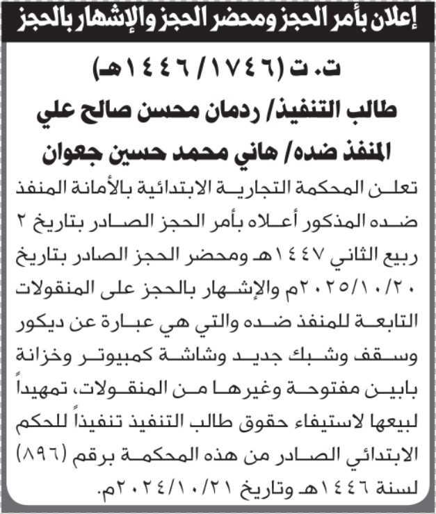 تعلن المحكمة التجارية بالأمانة للمنفذ ضده هاني محمد جعوان عن أمر الحجز الصادر إعلاناتمحاكم On أكتوبر 26, 2025 Share Share FacebookTwitterWhatsAppTelegramGoogle+البريد الإلكترونيPrint