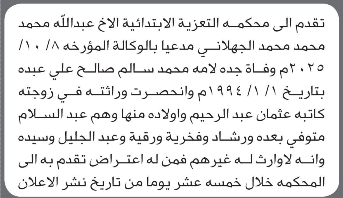 تعلن محكمة التعزية أن الأخ عبدالله محمد الجهلاني تقدم بدعوى انحصار وراثة إعلاناتمحاكم On أكتوبر 26, 2025 Share Share FacebookTwitterWhatsAppTelegramGoogle+البريد الإلكترونيPrint