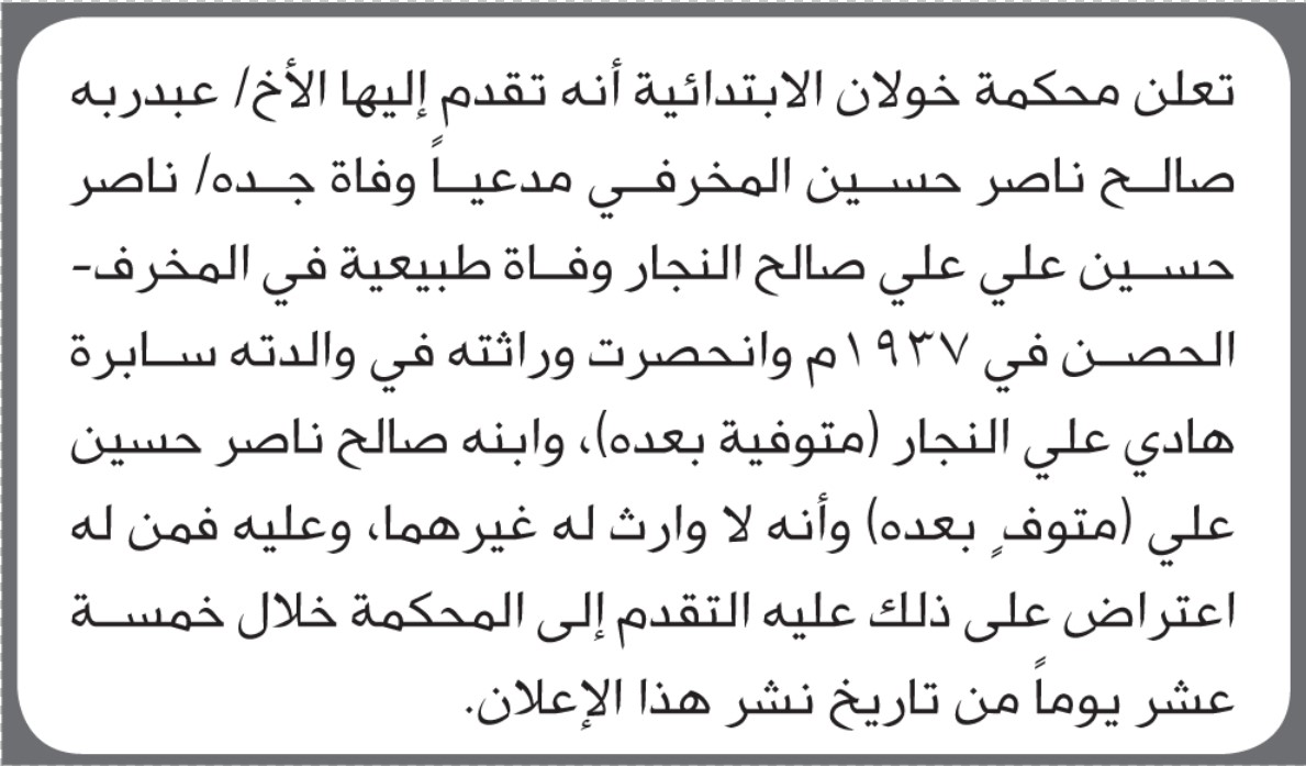 تعلن محكمة خولان أن الأخ عبدربه صالح المخرفي تقدم بدعوى انحصار وراثة إعلاناتمحاكم On أكتوبر 26, 2025 Share Share FacebookTwitterWhatsAppTelegramGoogle+البريد الإلكترونيPrint