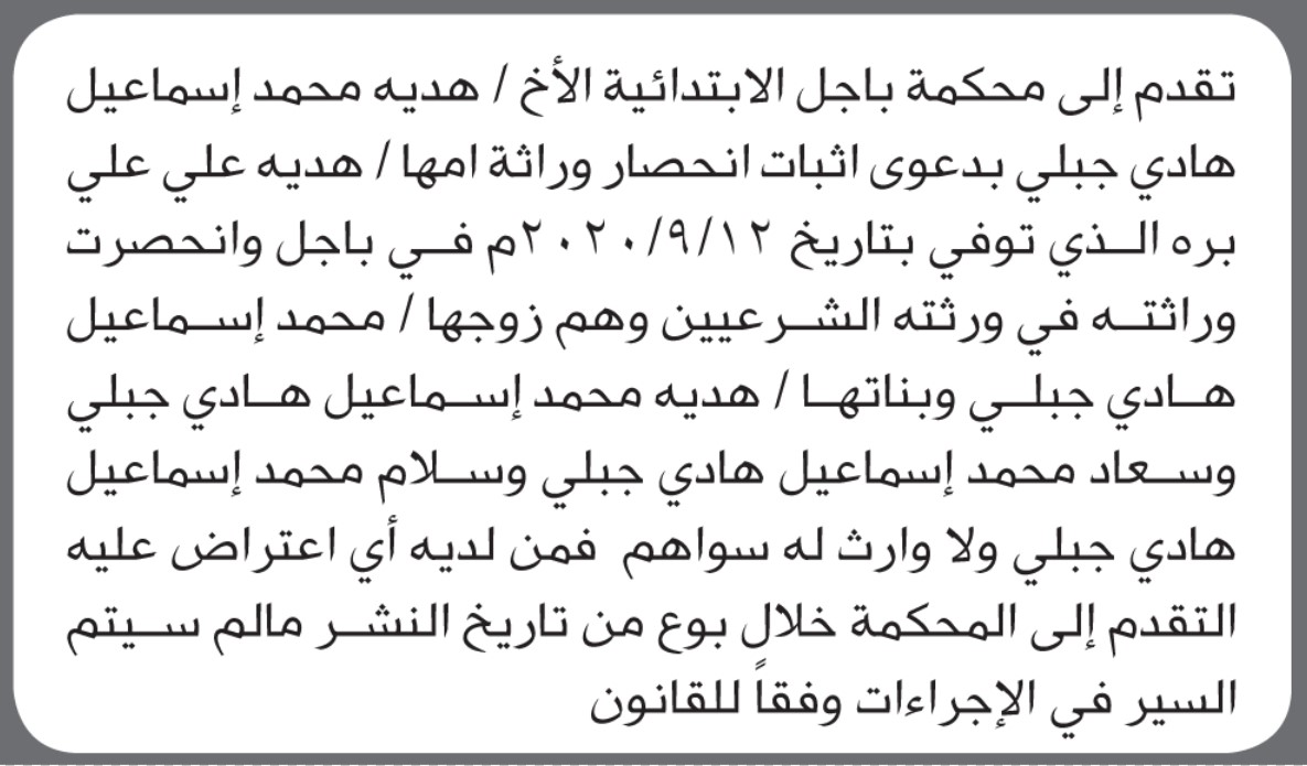 تقدم الى محكمة باجل الأخ هدية جبلي بطلب انحصار وراثة إعلاناتمحاكم On أكتوبر 26, 2025 Share Share FacebookTwitterWhatsAppTelegramGoogle+البريد الإلكترونيPrint