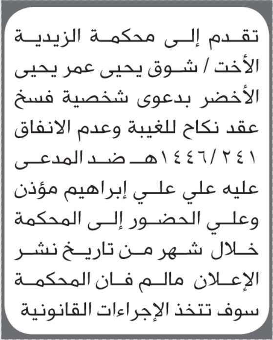 تعلن محكمة الزيدية ان على المدعى عليه علي مؤذن الحضور إلى المحكمة إعلاناتمحاكم On أكتوبر 26, 2025 Share Share FacebookTwitterWhatsAppTelegramGoogle+البريد الإلكترونيPrint