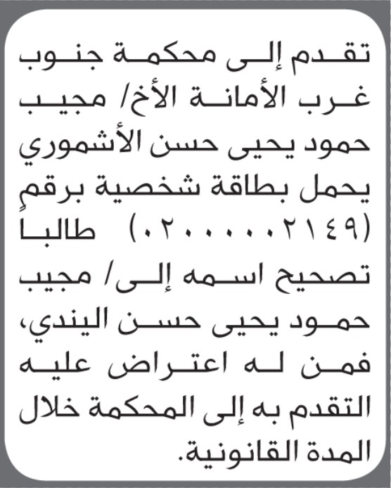 تقدم الى محكمة جنوب غرب الأمانة الأخ نجيب الاشموري بطلب تصحيح اسمه إعلاناتمحاكم On أكتوبر 26, 2025 Share Share FacebookTwitterWhatsAppTelegramGoogle+البريد الإلكترونيPrint