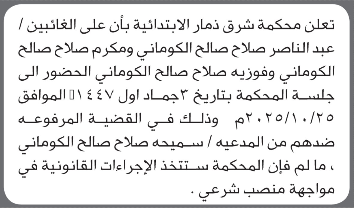 تعلن محكمة شرق ذمار بأن على الغائبين ابناء الكوماني الحضور الى المحكمة إعلاناتمحاكم On أكتوبر 27, 2025 Share Share FacebookTwitterWhatsAppTelegramGoogle+البريد الإلكترونيPrint
