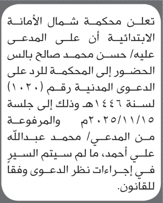 تعلن محكمة شمال الأمانة ان على المدعى عليه حسن بالس الحضور إلى المحكمة إعلاناتمحاكم On أكتوبر 26, 2025 Share Share FacebookTwitterWhatsAppTelegramGoogle+البريد الإلكترونيPrint