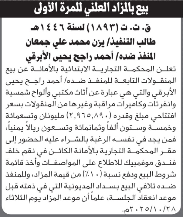 تعلن المحكمة التجارية بالأمانة عن بيع المنقولات التابعة لأحمد الأبرقي إعلاناتمحاكم On أكتوبر 27, 2025 Share Share FacebookTwitterWhatsAppTelegramGoogle+البريد الإلكترونيPrint