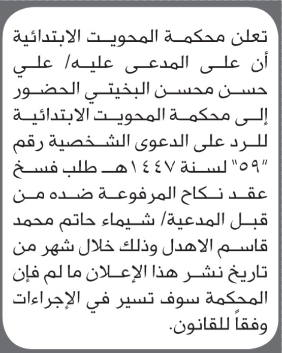 تعلن محكمة المحويت الابتدائية بأن على/ علي البخيتي الحضور إلى المحكمة إعلاناتمحاكم On أكتوبر 27, 2025 Share Share FacebookTwitterWhatsAppTelegramGoogle+البريد الإلكترونيPrint