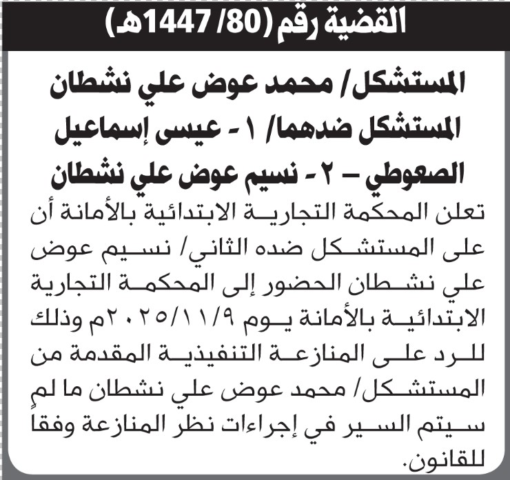تعلن المحكمة التجارية بالامانة ان على المستشكل ضده الثاني نسيم نشطان الحضور إلى المحكمة إعلاناتمحاكم On أكتوبر 27, 2025 Share Share FacebookTwitterWhatsAppTelegramGoogle+البريد الإلكترونيPrint