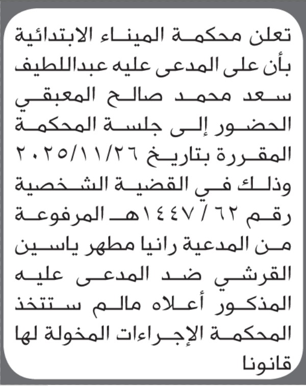 تعلن محكمة الميناء الابتدائية بأن على/ عبداللطيف المعبقي الحضور إلى المحكمة إعلاناتمحاكم On أكتوبر 28, 2025 Share Share FacebookTwitterWhatsAppTelegramGoogle+البريد الإلكترونيPrint