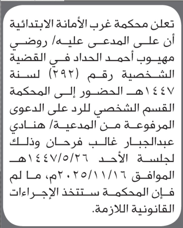 تعلن محكمة غرب الأمانة بأن على/ روضي الحداد الحضور إلى المحكمة إعلاناتمحاكم On أكتوبر 28, 2025 Share Share FacebookTwitterWhatsAppTelegramGoogle+البريد الإلكترونيPrint