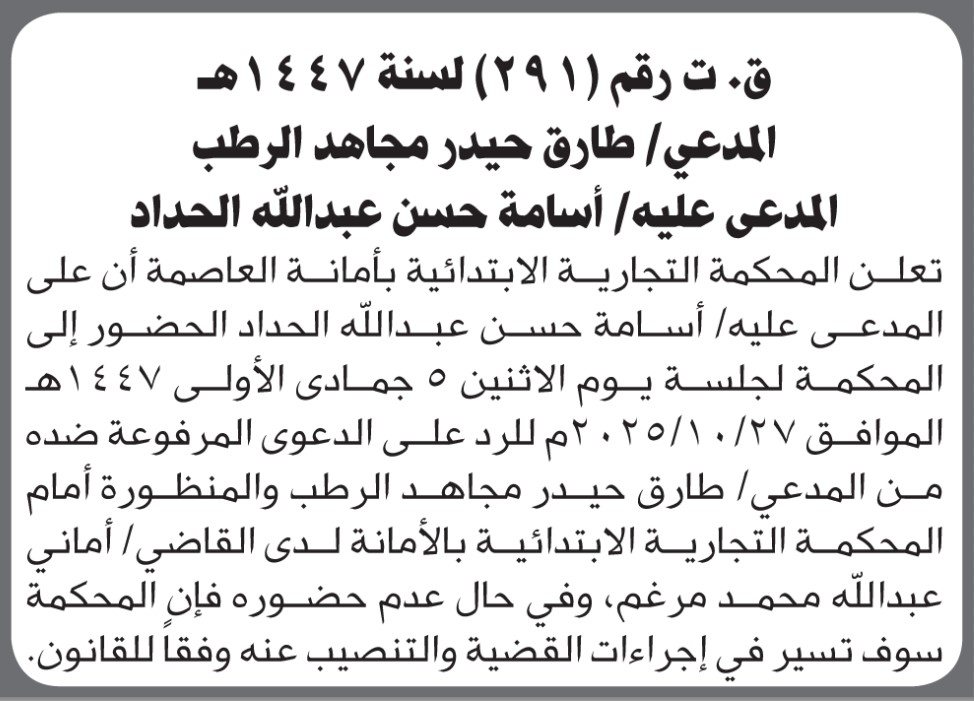 تعلن المحكمة التجارية بالأمانة أن على المدعى عليه أسامة حسن الحداد الحضور إلى المحكمة إعلاناتمحاكم On أكتوبر 28, 2025 Share Share FacebookTwitterWhatsAppTelegramGoogle+البريد الإلكترونيPrint
