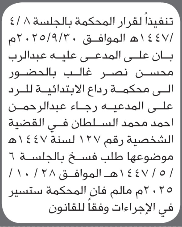 تعلن محكمة رداع أن على المدعى عليه عبدالرب محسن غالب الحضور إلى المحكمة إعلاناتمحاكم On أكتوبر 28, 2025 Share Share FacebookTwitterWhatsAppTelegramGoogle+البريد الإلكترونيPrint