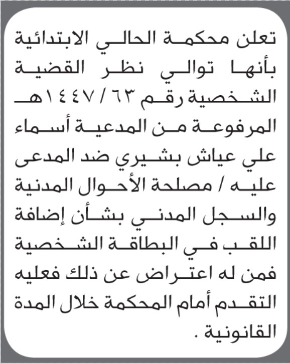 تعلن محكمة الحالي أن الأخ أسماء بشيري تقدمت بطلب إضافة اللقب لاسمها إعلاناتمحاكم On أكتوبر 29, 2025 Share Share FacebookTwitterWhatsAppTelegramGoogle+البريد الإلكترونيPrint